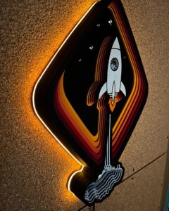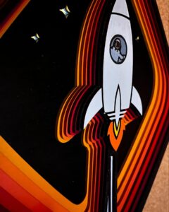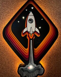 laser cut, hand painted and assembled, baltic birch plywood and plexiglass 14″ x 10.5″ x 1.75″